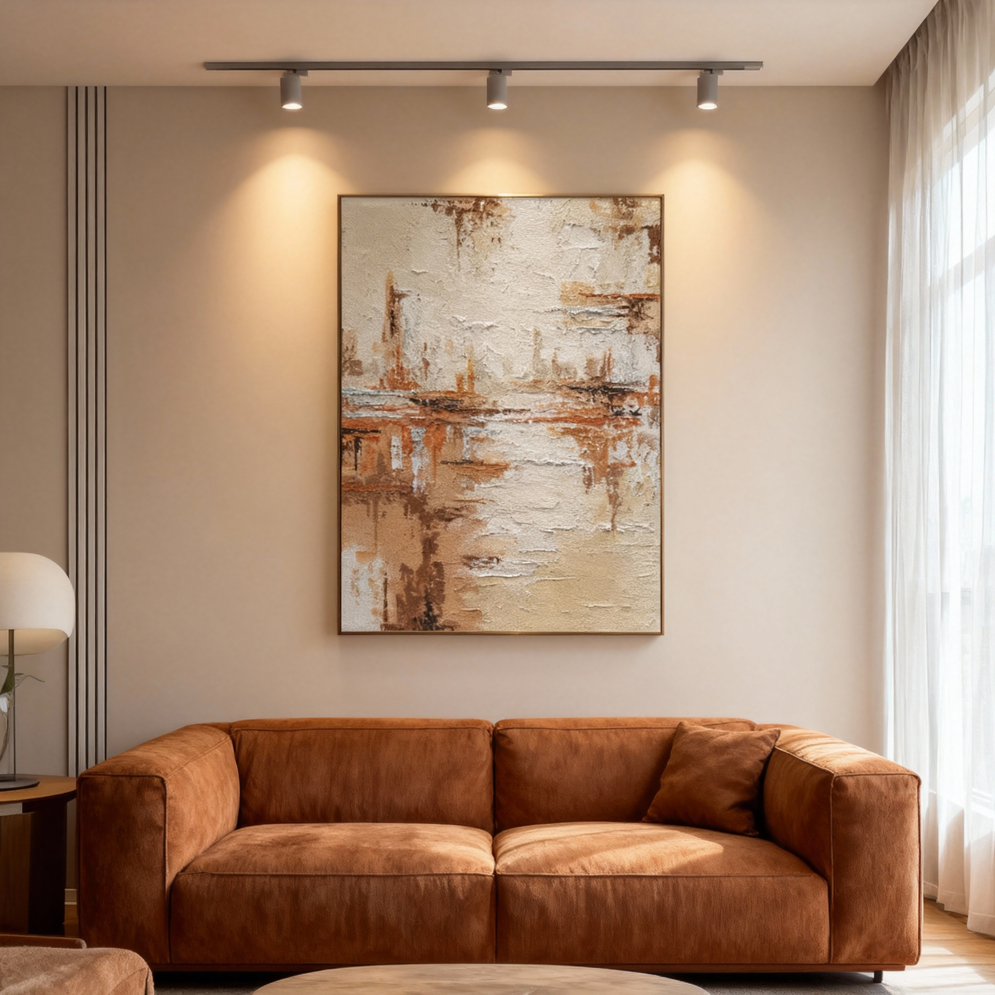 This rustic abstract artwork uses earthy red-brown, cream, and deep brown hues with bold, textured brushstrokes to evoke the feeling of ancient ruins or weathered cityscapes. The hand-painted impasto technique adds emotional depth and visual interest. Perfectly complements orange velvet sofas and warm lighting, creating a cozy, storytelling atmosphere in your living room. A must-have for modern art collectors.